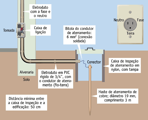 2. O aterramento das tomadas exige que o fio-terra esteja conectado a uma barra de cobre de três metros, fincada completamente dentro do solo.